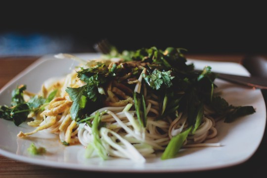 First up is Trader Joe’s and then to 99 Ranch and had some lunch we picked up from Momo’s Bistro–a restaurant with very traditional Taiwanese dishes. Ended up eating quite a bit so by the time dinner came around we weren’t very hungry so we quickly put together the above dish of dry noodles (noodles cooked and then removed from the water) and added cilantro, green onions, and fried egg. The noodles brought three pouches of sauces that are added and mixed together. It was so delicious!!