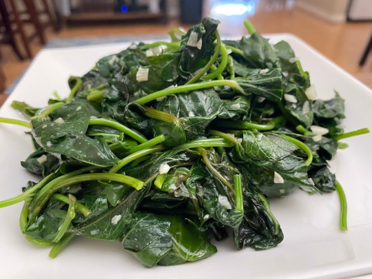 I can confirm that the yam leaves in the picture are “yard to table”. We picked these yams leaves from a friend’s yard and cooked them the very next day. Until recently, I had no idea you could eat yam leaves. I thought you were only supposed to eat the yams and then discard the rest of the plant. Yum, yam leaves!