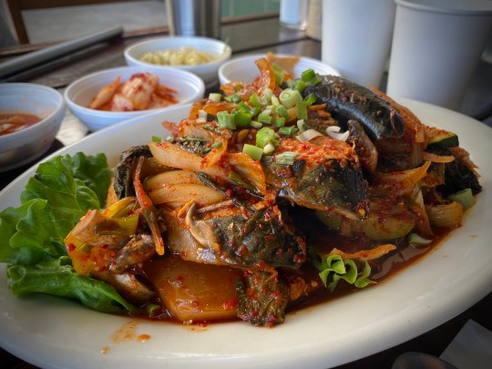 We were back at my favorite Korean restaurant, the one with the Korean ladies prepping veggies at a corner table. During a previous dinner at this restaurant, we meant to order a broiled fish and accidentally ordered this boiled one. We were surprised when this dish, clearly not a broiled fish, was brought out. One of the Korean ladies quickly pointed out our mistake with the menu. We ended up loving the flavor of the hard-boiled mackerel. So this week, we decided to order this dish again–this time intentionally. The Korean lady that usually takes the order looked confused and said, “last time you said you didn’t want.” I told her last week was a mistake, but we ended up loving it. A lovely smile appeared on her face as she went to place our order.