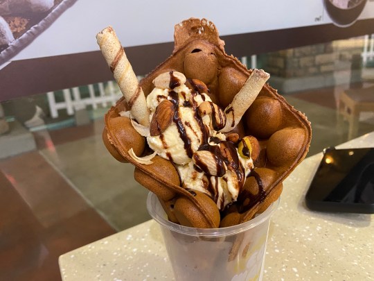 I am kicking myself for carrying around my camera all day except when I went to go get some dessert! Oh well, I can only imagine how beautiful my egg waffle would look using my camera instead of my phone. I first tried this style of waffle in Hong Kong and so I wanted to relive that memory for a bit.