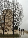 8 years ago, on the eve of my birthday, I somehow managed to get a large group of friends together and arranged for us to have a private tour of the museum gardens at the Getty Center. It was a beautiful day–lightly raining and a little chilly. We were all attentively listening to the docent give the tour of the gardens all the while the raindrops were pattering on all of our umbrellas. The garden plants and features were muted in a beautiful gray, but my favorite view was of the dark naked trees towering over passersby reflected on the wet floors as they held their umbrellas. In the background were the light-colored stone walls and floors of the museum against a stormy sky.